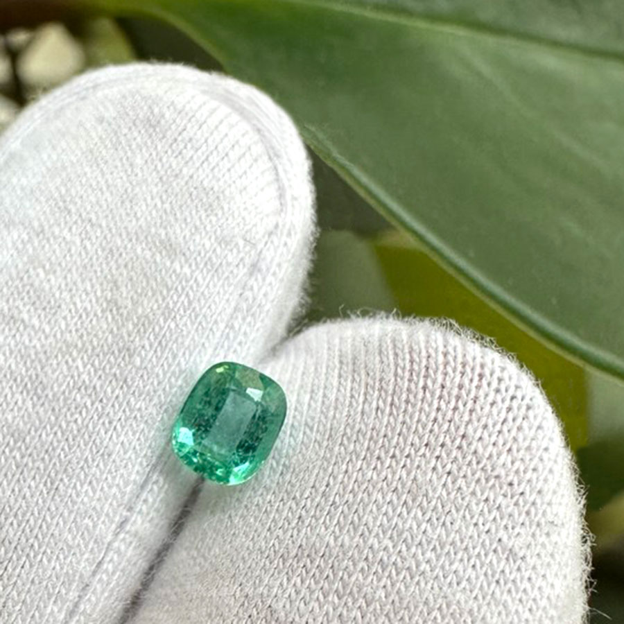 Натуральний смарагд у формі огранювання кушон. На відміну від інших дорогоцінного каміння групи берилу, смарагди часто містять включення, тріщини та інші дефекти. Чистота смарагду оцінюється на око, на відміну від діаманту, де використовують 10-кратні збільшувальні лупи. Якщо смарагд не має включень, які видно неозброєним оком, такі камені вважаються бездоганними. Даний зразок має чистоту 2 (VS) із 5 можливих!