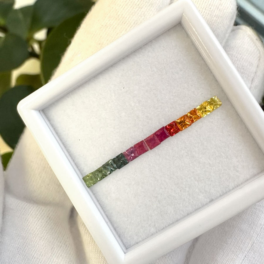 Відмінно підібраний набір з 13 каліброваних кольорових натуральних сапфірів у формі огранювання квадрат принцеса. Купуючи каміння вибірково з набору — вартість 150$/карат. Чудово виглядатимуть у золотому кільці-доріжці.