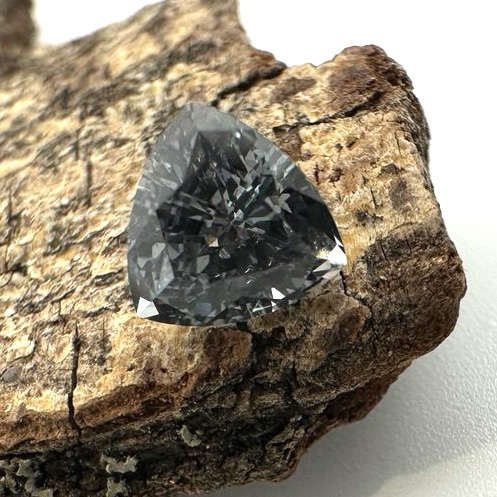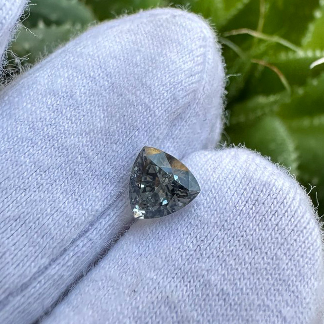 Натуральна сталево-сіра шпінель в огранюванні триліон з Мозамбіку. Сучасна геометрична форма підкреслює глибину відтінку та виразний блиск каменя. В наявності парний камінь красивого синьо-сірого відтінку — чудовий варіант для Ваших сережок.