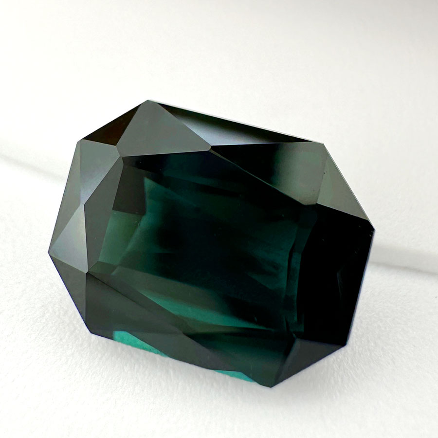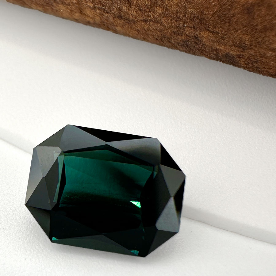 Чистий зелений турмалін верделить із синюватим відтінком в ограновуванні октагон.