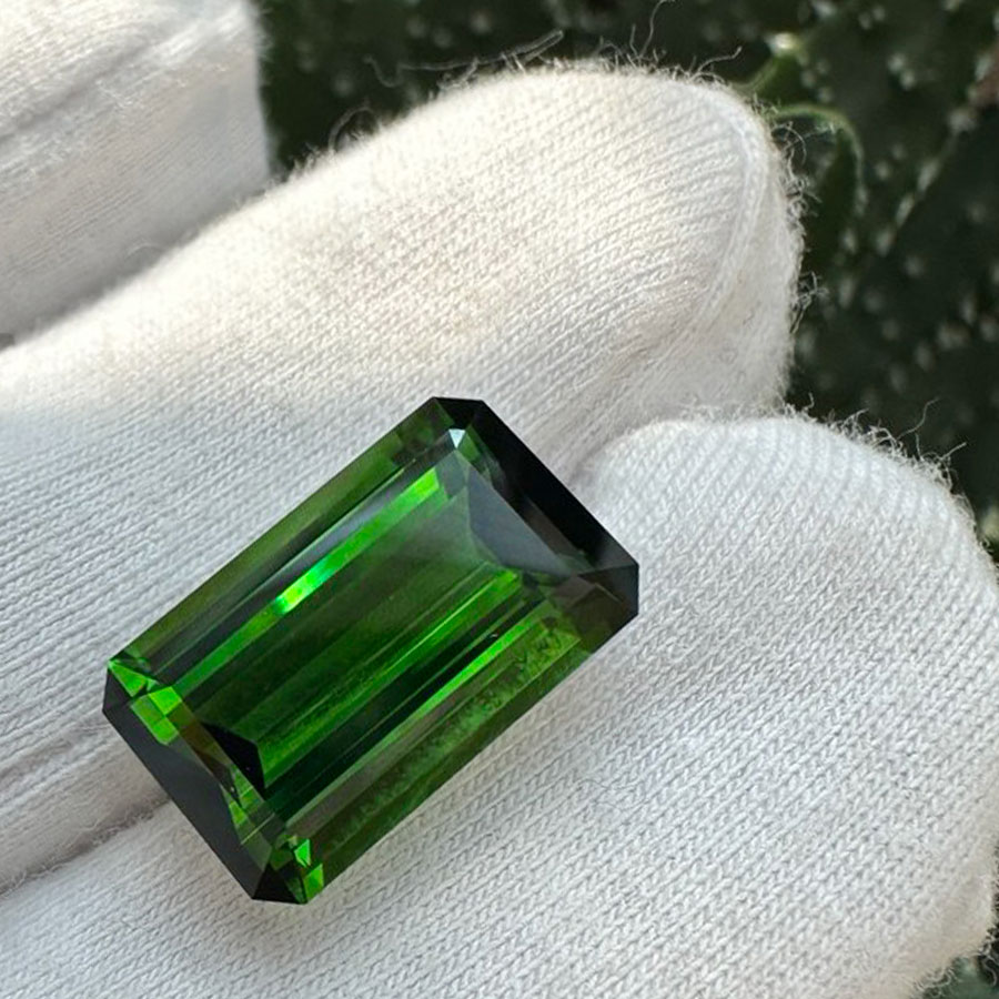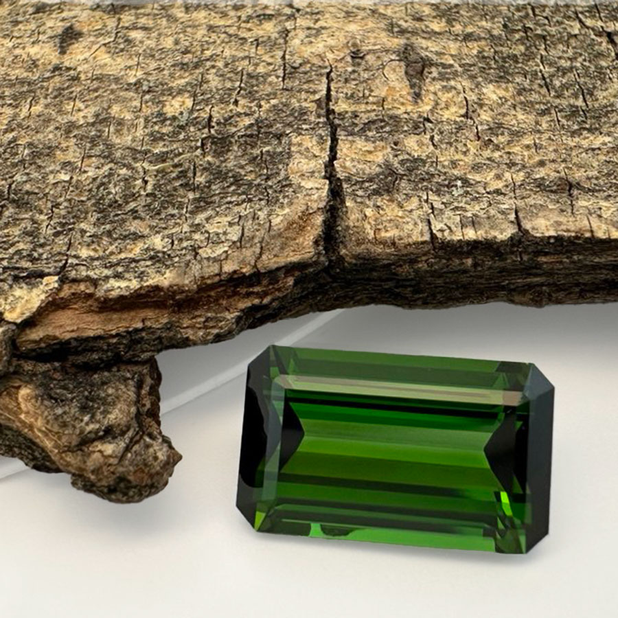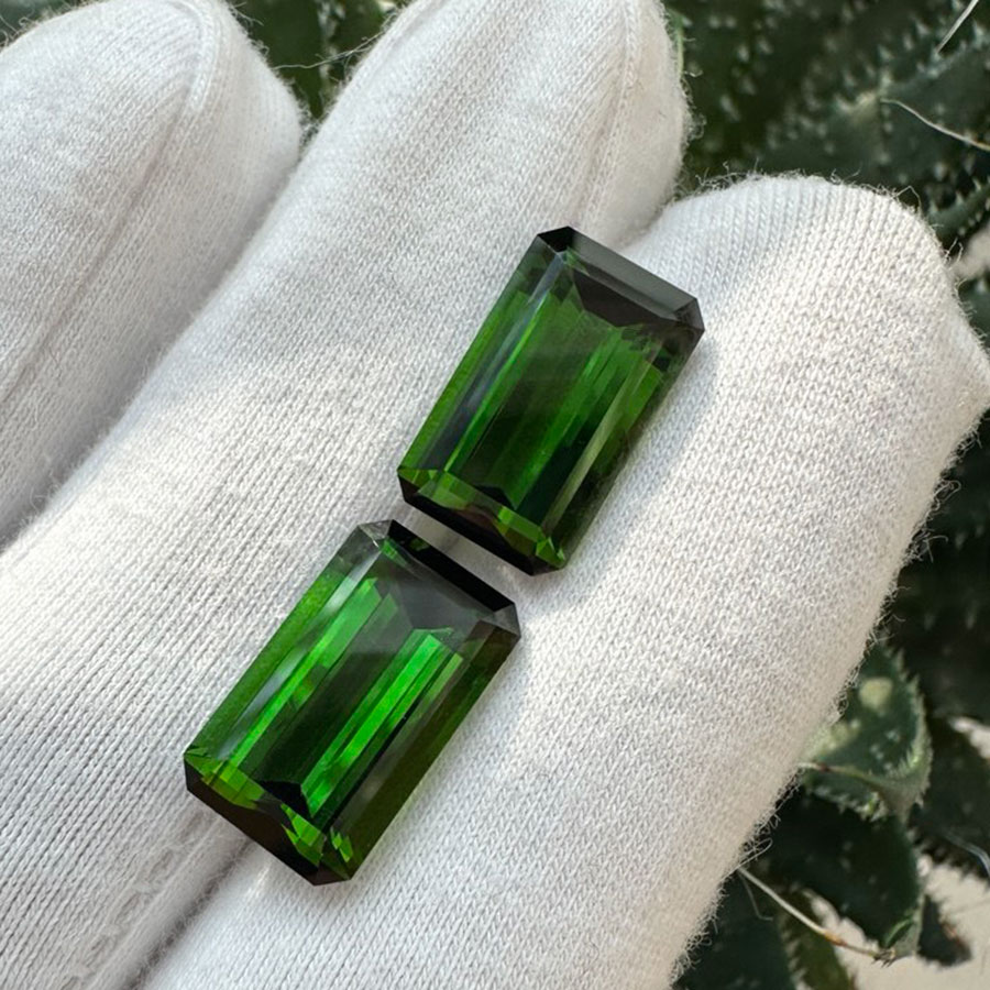 Монументальний чистий зелений турмалін — верделіт. Цей камінь цінується за свій неймовірний глибокий смарагдовий колір, при тому на відміну від смарагдів не має в собі включень, тріщин чи інших вад. Завдяки високій твердості ($7-7,5$ за шкалою Мооса) та сильному скляному блиску цей камінь підходить для щоденного носіння в ювелірних прикрасах. Окрему цінність йому додає його властивість змінювати насиченість залежно від кута огляду, що надає кристалу особливої візуальної глибини (плеохроїзм). В наявності є парний камінь №260004