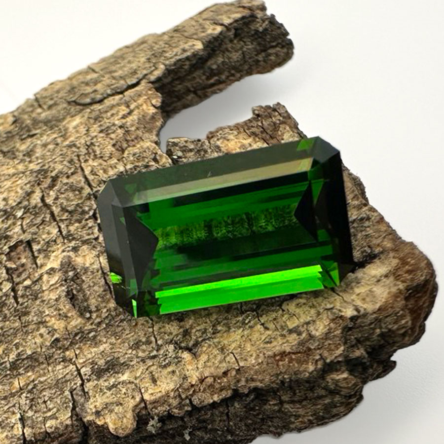 Монументальний чистий зелений турмалін — верделіт. Цей камінь цінується за свій неймовірний глибокий смарагдовий колір, при тому на відміну від смарагдів не має в собі включень, тріщин чи інших вад. Завдяки високій твердості ($7-7,5$ за шкалою Мооса) та сильному скляному блиску цей камінь підходить для щоденного носіння в ювелірних прикрасах. Окрему цінність йому додає його властивість змінювати насиченість залежно від кута огляду, що надає кристалу особливої візуальної глибини (плеохроїзм). В наявності є парний камінь №260003